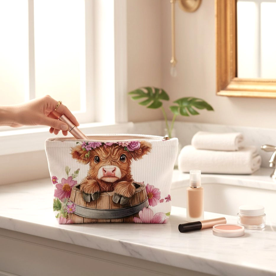 Adorable Highland Calf Corduroy Lined Makeup Cosmetic Bag