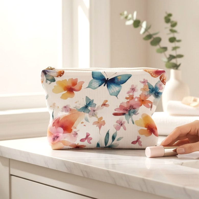Chic Flora & Butterflies Corduroy Lined Makeup Cosmetic Bag